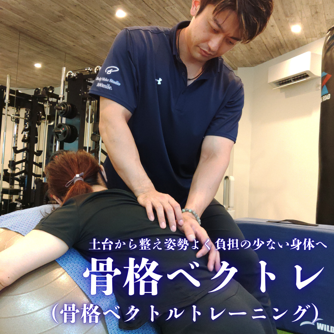 100mile.コースは運動個別指導の『パーソナルトレーニング』と、骨格から身体を整える手技『骨格ベクトルトレーニング』を組み合わせた内容になります。トレーニングセッション3回実施に付き1回骨格ベクトルトレーニングを行い、姿勢の崩れや過度な疲労を予防しつつトレーニングを継続することができます。お忙しくなかなかご自身でお身体をメンテナンスする時間のない方や、姿勢についても気になるお客様に特にご好評頂いております。